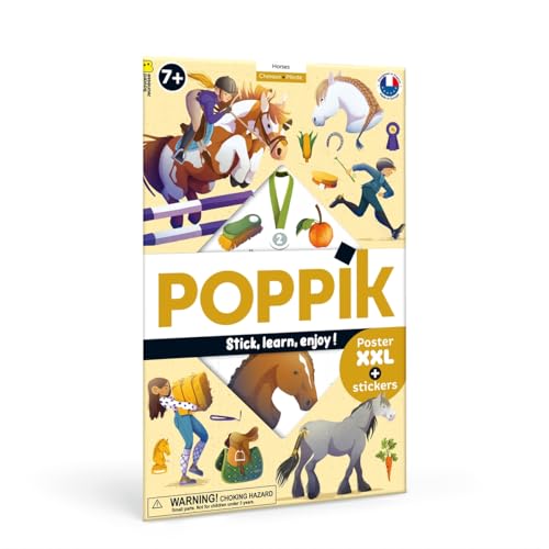POPPIK 1841263 klistermärkesaffisch, hästar, interaktiv läroaffisch med avtagbara klistermärken, flerspråkig kunskapsposter, för barn från 7 år, 68 x 100 cm