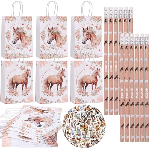 Fizdoqg hästpresent barnkalas set Give Aways hästfödelsedag gästpresenter 12 hästpennor, 12 hästar presentpåsar och 50 hästar klistermärken för barn pojkar flickor