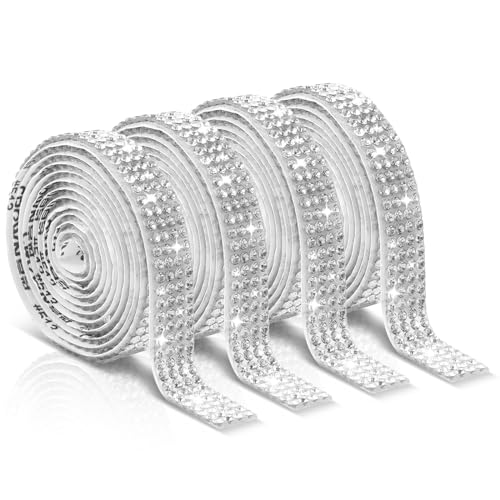 Telooco Självhäftande strassband, 4 rullar, bling, kristall, strass, remsor, klistermärken, glitter, rulle, för gör-det-själv-hantverk, kläder, bilskor (4 rader på 1 meter, silver)
