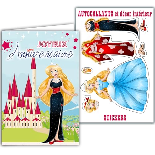 Grattis på födelsedagen prinsessa kort med 8 klistermärken kläder blå eller aftonklänningar eller kimono röd blommig klänning docka dekoration slott bal saga vit kuvert, 12 x 17,5 cm 67-1038-2