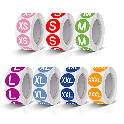 Kläder storlek klistermärken färgglada 2,5 cm runda självhäftande storleksetiketter vattentäta avtagbara för t-shirt kläder etiketter 7 rullar (XS, S, M, L, XL, XXL, XXXL)