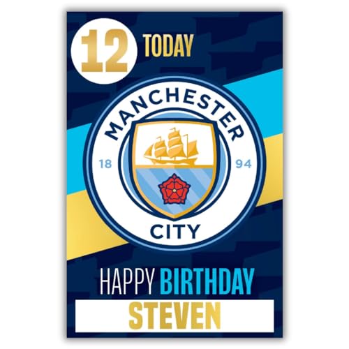 Manchester City fotbollsklubb födelsedagskort. Levereras med klistermärken för att anpassa din ålder och namn, blå