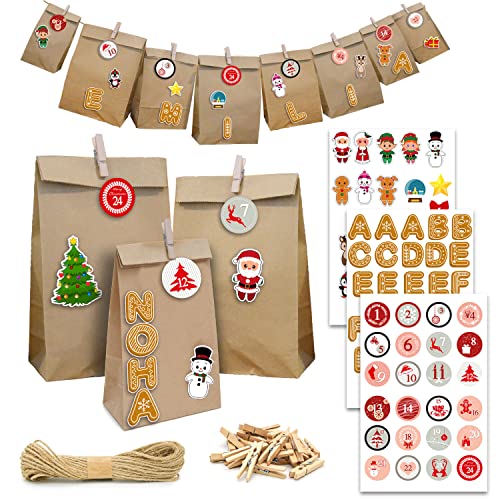 DuneDesign XXL-set med namn: Adventskalender för fyllning av stora påsar – 24 papperspåsar i 3 storlekar 100 klistermärken pysselset gör-det-själv adventskalender, tillbehör, personlig adventskalender för gör-det-själv-pyssel