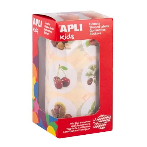 APLI Kids 20052-33 mm runda pedagogiska klistermärken rulle med illustrationer på träd och deras frukter.