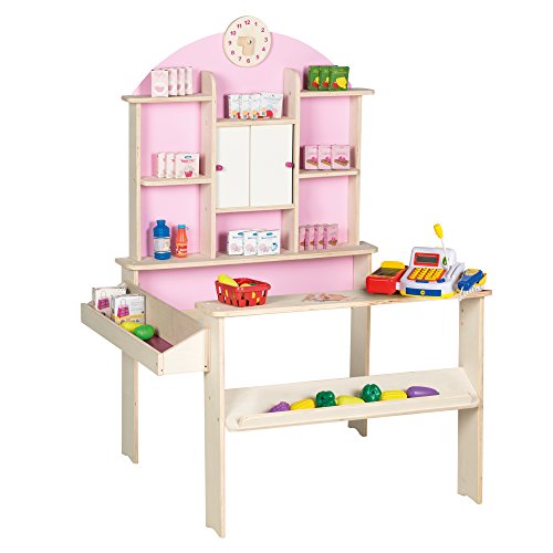 Roba Butiker, barn handlarbutik inkl. över 100 delar inköpsaccessoarer och elektronisk kassa, försäljningsstånd naturligt trä, rosa, vit med sidodisk och klocka