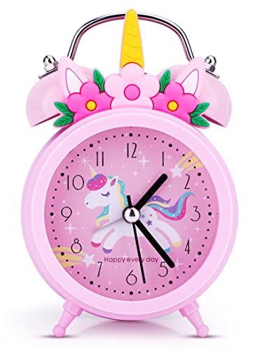 TCJJ enhörning väckarklocka flicka, inte tickande barn väckarklocka flickor, tyst nattduksbord rosa väckarklocka, hög dubbel klocka klocka med bakgrundsbelysning, lämplig som skolgåva