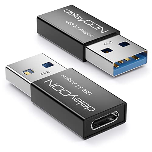 deleyCON USB C Adapter USB 3.0 (2 Stycken) 5Gbit/s USB-C till USB-A, för Laddningskabel Datakabel Laddare, för iPhone 16 15, IPad, Airpods, Klocka, Galaxy S25/S24/S23, PC, Surfplatta, Notebook - Svart
