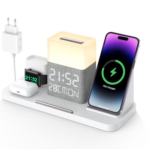 6-i-1 laddningsstation med klocka, trådlös laddare med nattljus, 30 watt adapter, ATEVENSE snabbladdningsstation kompatibel med iPhone 15/14/13/12 och AirPods och iWatch
