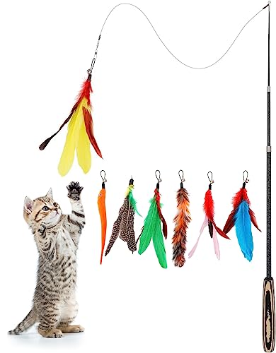 Pawaboo Interaktiv kattleksak med fjäder, set med 7 expanderbar, fjäderstav, extra lång 96 cm med liten klocka, rolig träningspinne, Chaser-tråd, färgglada ränder
