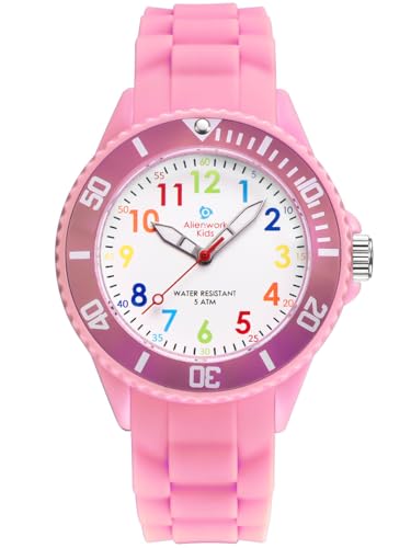 Alienwork Barn lärande klocka barn pojke flicka lärande tid vattentät 5 ATM, Rosa / Brokigt / Silikon Armband Rosa, rem