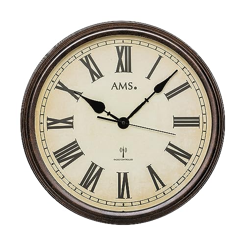 AMS F5977 Radioväggklocka, trä radioklocka vintage retro vägg klocka romerska siffror, 46 x 46 cm