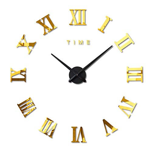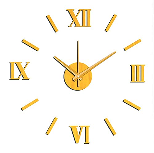 MPM Gör-det-själv väggklocka, stor självhäftande klocka, guld, modern 3D-dekal väggklocka, romerska siffror och indeser, kvartsurverk, väggdekoration, E01.3513