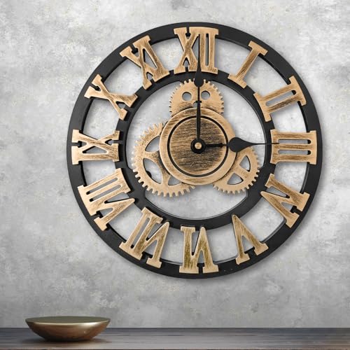 ALEENFOON klocka tysta väggklockor, 3D-växlar vintage industriell tyst icke-tickande romerska siffror hängande klocka för vardagsrum kök utan tickande ljud inomhusklocka (50 cm, romerska nummer)