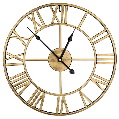 Väggklocka med romerska siffror, retro industriell dekorationsstil metallväggklocka, batteridriven tyst klocka för vardagsrum och kontor hem väggdekoration, guld, 61 cm