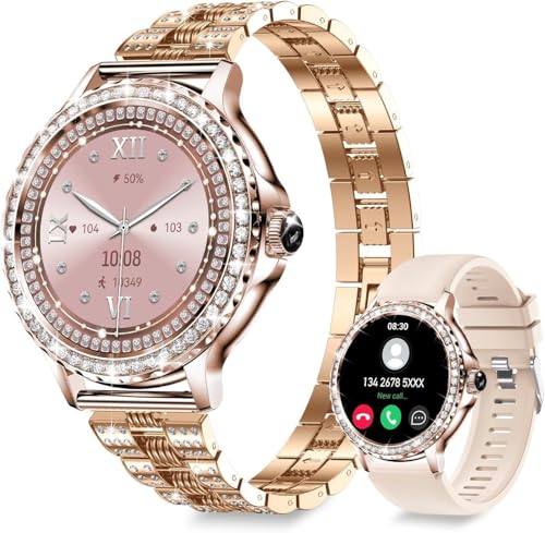 LONGLU Smart Watch för kvinnor med Bluetooth telefonsamtal, damer smartklocka för iPhone och Android telefoner, multisport, fitnesstracker, klocka med svar/gör samtal, vattentät (guld)