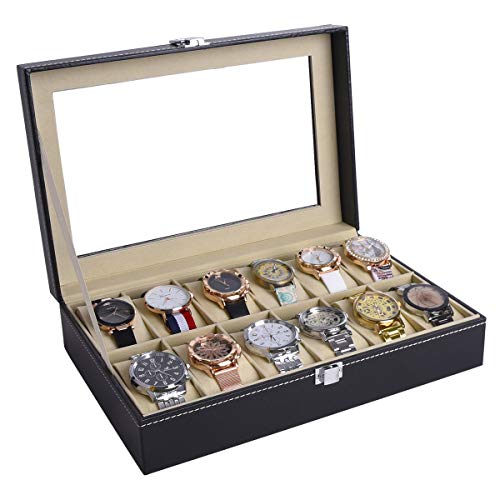 AUTOARK Läder 12 klockbox glas topp klocka display fodral organisatör, svart, AWU-022