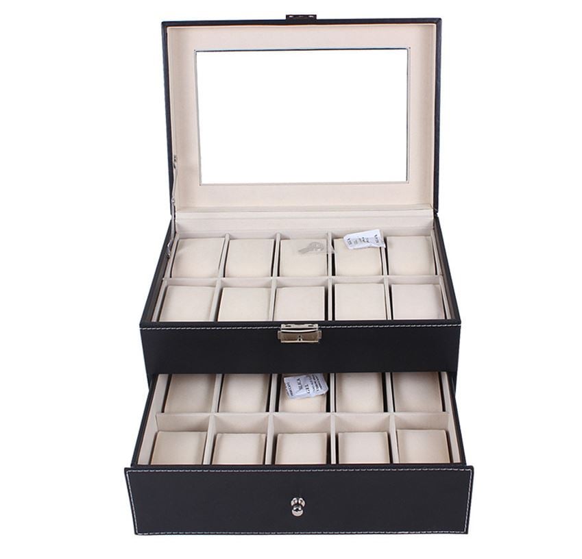 Watchbox Klockbox för 20 st klockor svart - vit söm och fönster