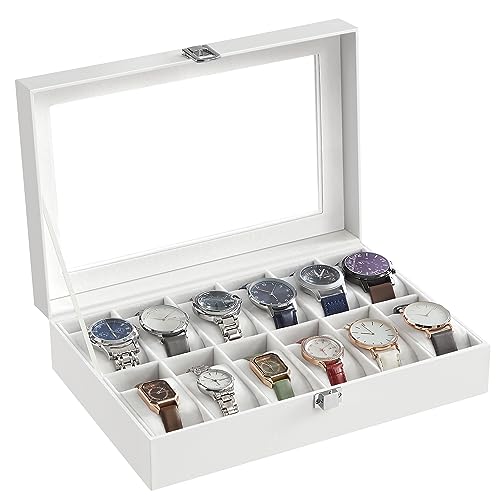 SONGMICS 12-spårs klockbox, klocka displayhållare fodral, med glaslock, avtagbar klockkudde, sammetsfoder, metalllås, vitt syntetiskt läder, vitt foder JWB202