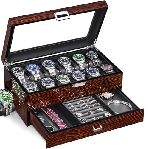 Högklassig klockbox för män, 12 spår trä klockfodral, displaybox med glaslock, 2-lagers klockhållare för smycken, perfekt present i presentask