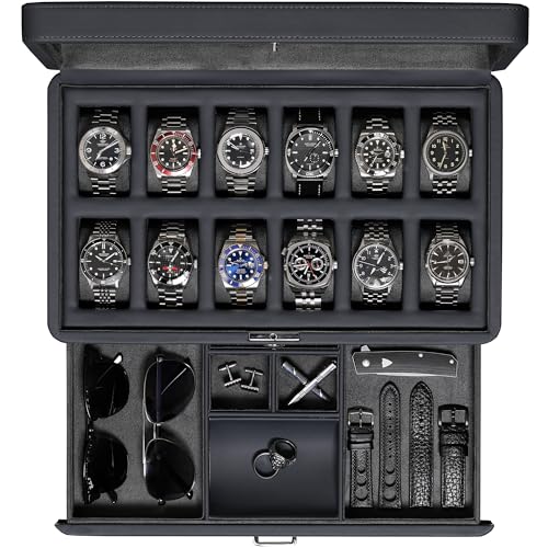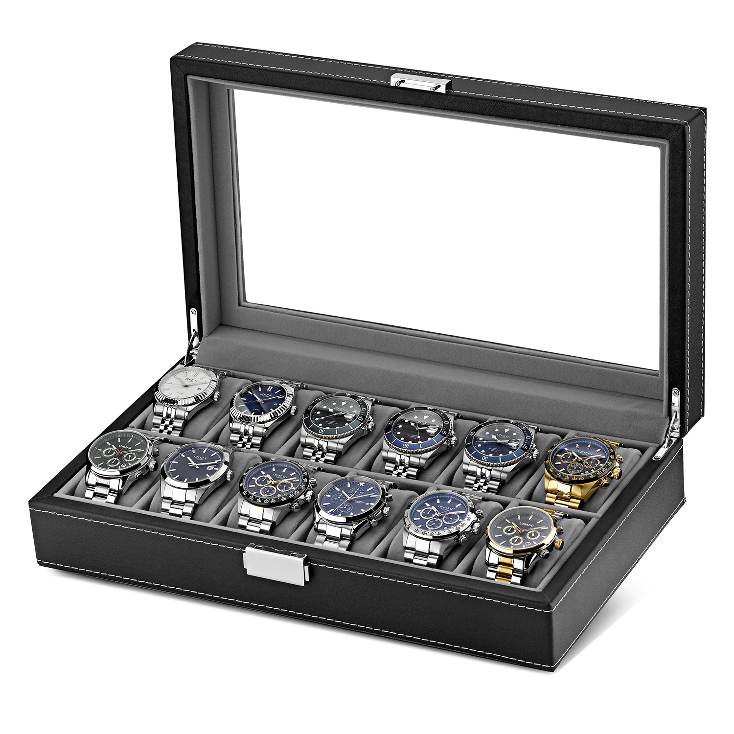 ROTHWELL Lyxig klocklåda för 12 klockor, klockbox i PU-läder med äkta glaslock, utdragbar tillbehörslåda med flera fack (kol)
