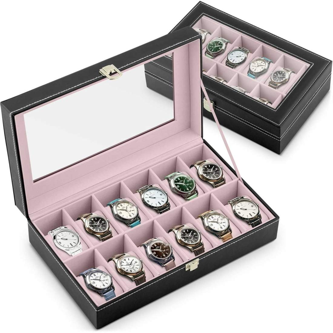 Lyxig klocklåda för 12 klockor Massido MS-710 Svart/Laxrosa