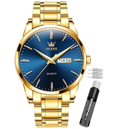 OLEVS Klockor män diamant affärsklänning analog kvarts rostfritt stål vattentät lysande datum tvåfärgad lyx casual armbandsur presenter för män, 9931-blå/guld/silver, Klassisk