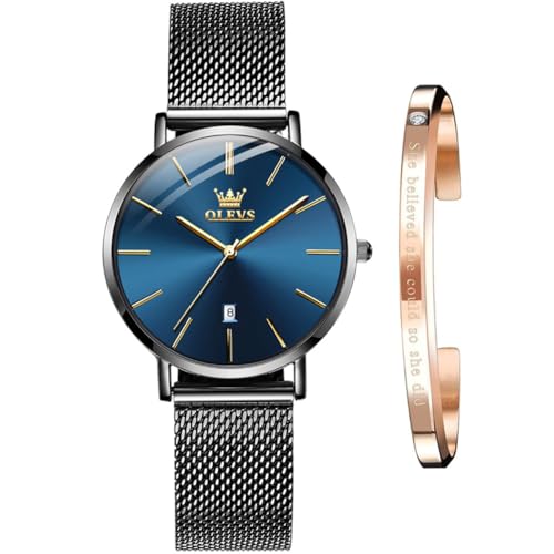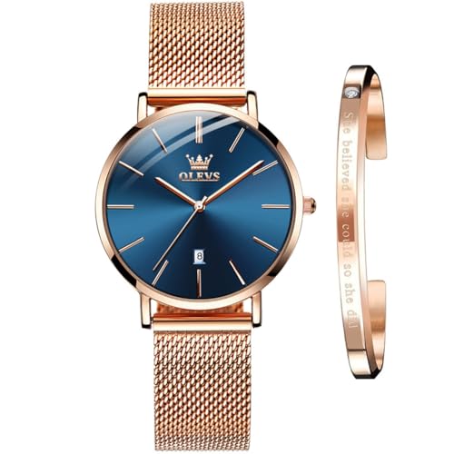 OLEVS Damklocka Lyx Rose Gold Kvinnor Slim Tunn Lättviktsklocka Rostfritt stål Mesh Klockor Mode Vattentät Dam Armbandsur,Justerbart Armband