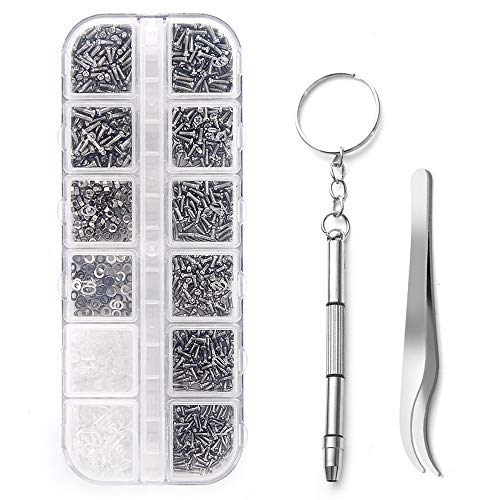 Becory glasögonreparationssats, 1100 st små skruvar och 5 par näsdynor rostfritt stål set med mikroskruvmejselpincett för glasögon, solglasögon, klockreparation