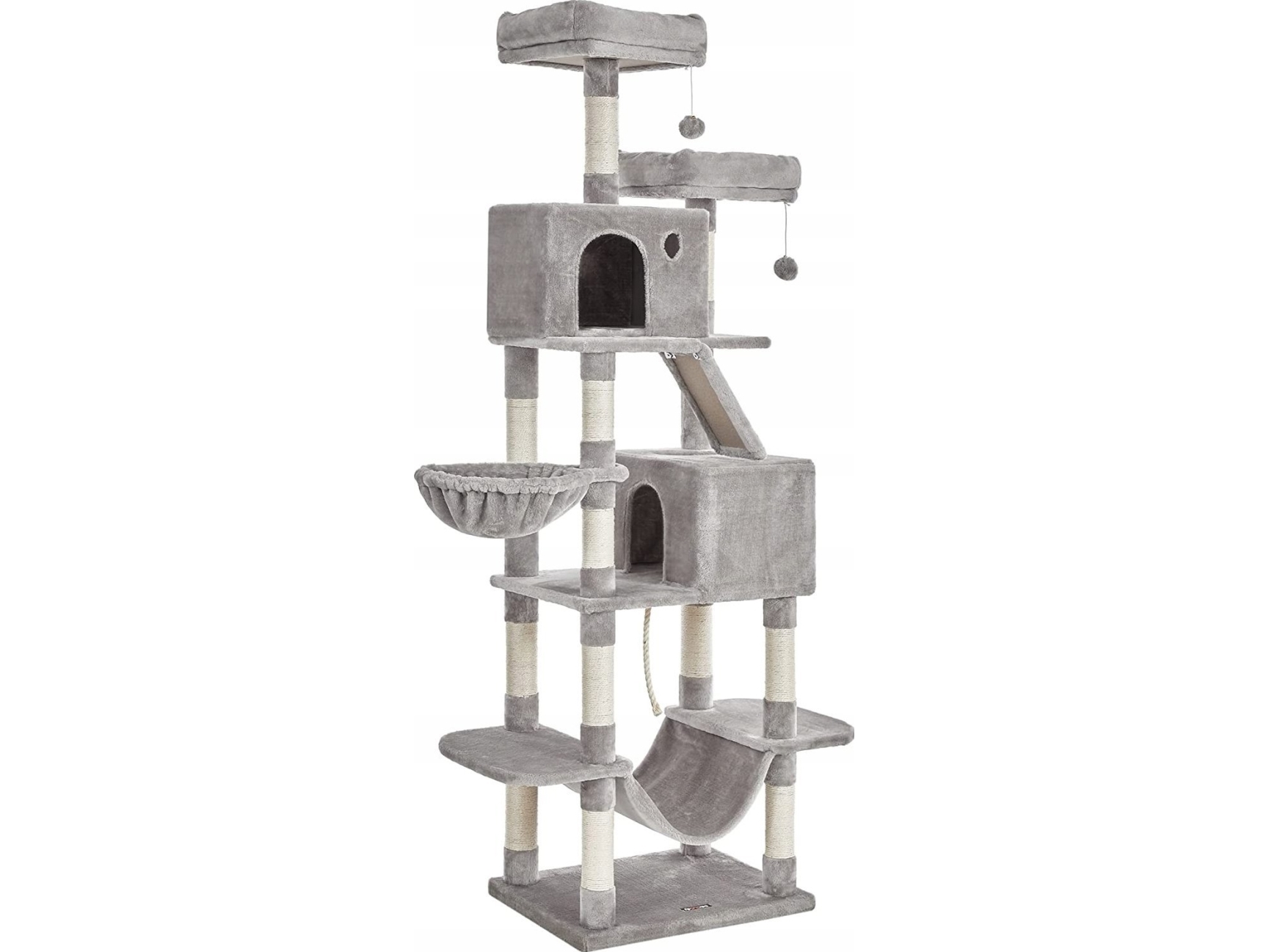 COSTWAY 168cm klösbräda i trä, klösbräda för katt i flera våningar stor, katträd med grotta, stege, mattor, bollar & hängmatta, aktivitetsträd kattmöbel lekstuga klätterträd, beige+natur