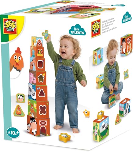 SES Creative – Tiny Talents – Stapelkuber och formsorterare 2 i 1 – bondgårdsdjur – stapeltorn Baby – Montessori leksak från 1 år – sensoriska leksaker – 7 stapelbara klossar i bondgårdstema – från