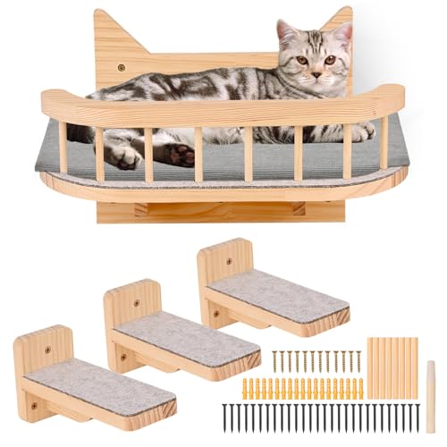 Katt vägghyllor katt hängmatta med 3 steg, kattväggmöbler med grå kudde, katthyllor och sittstänger för vägg, katt klättring hylla, katt klösträd för klättring sömn lek