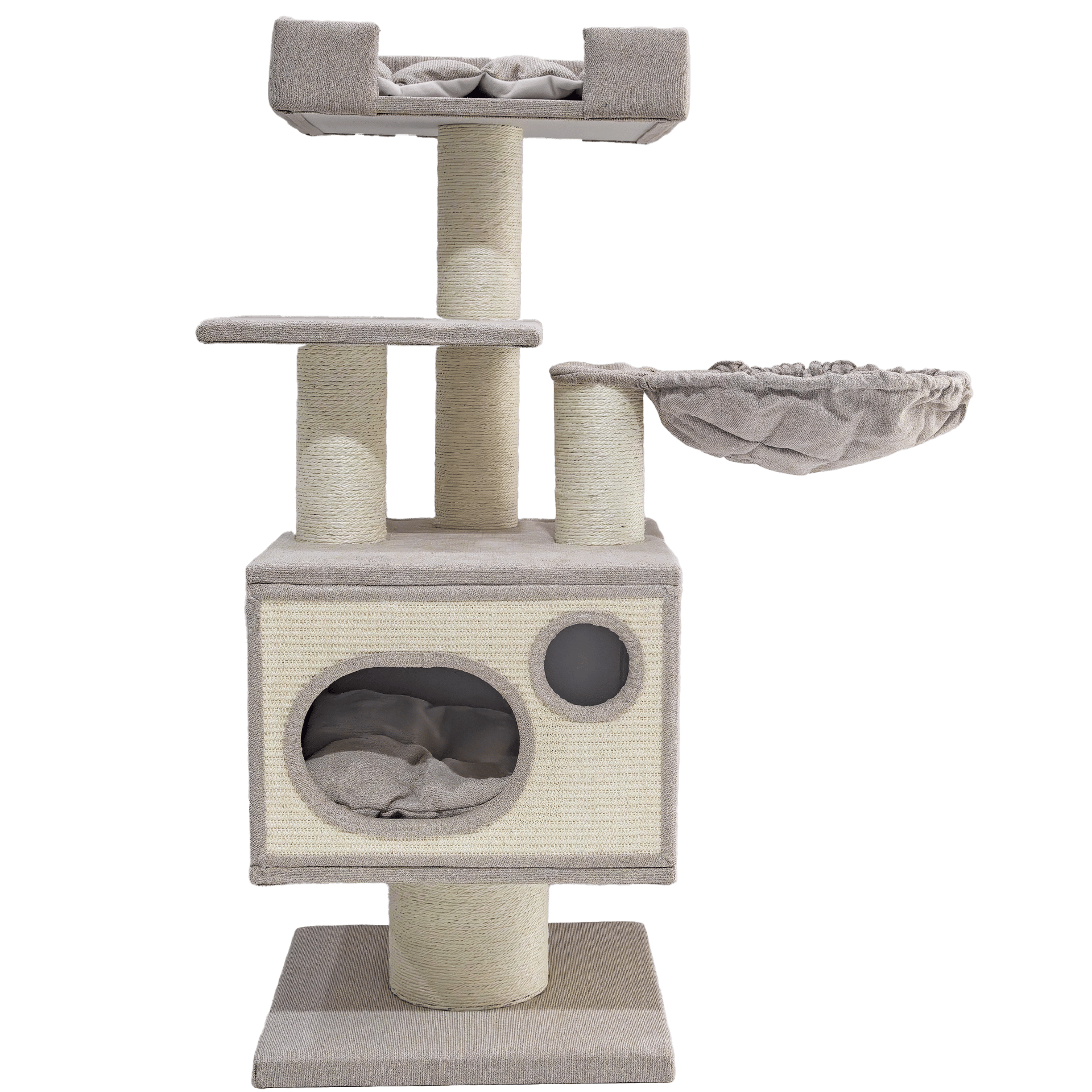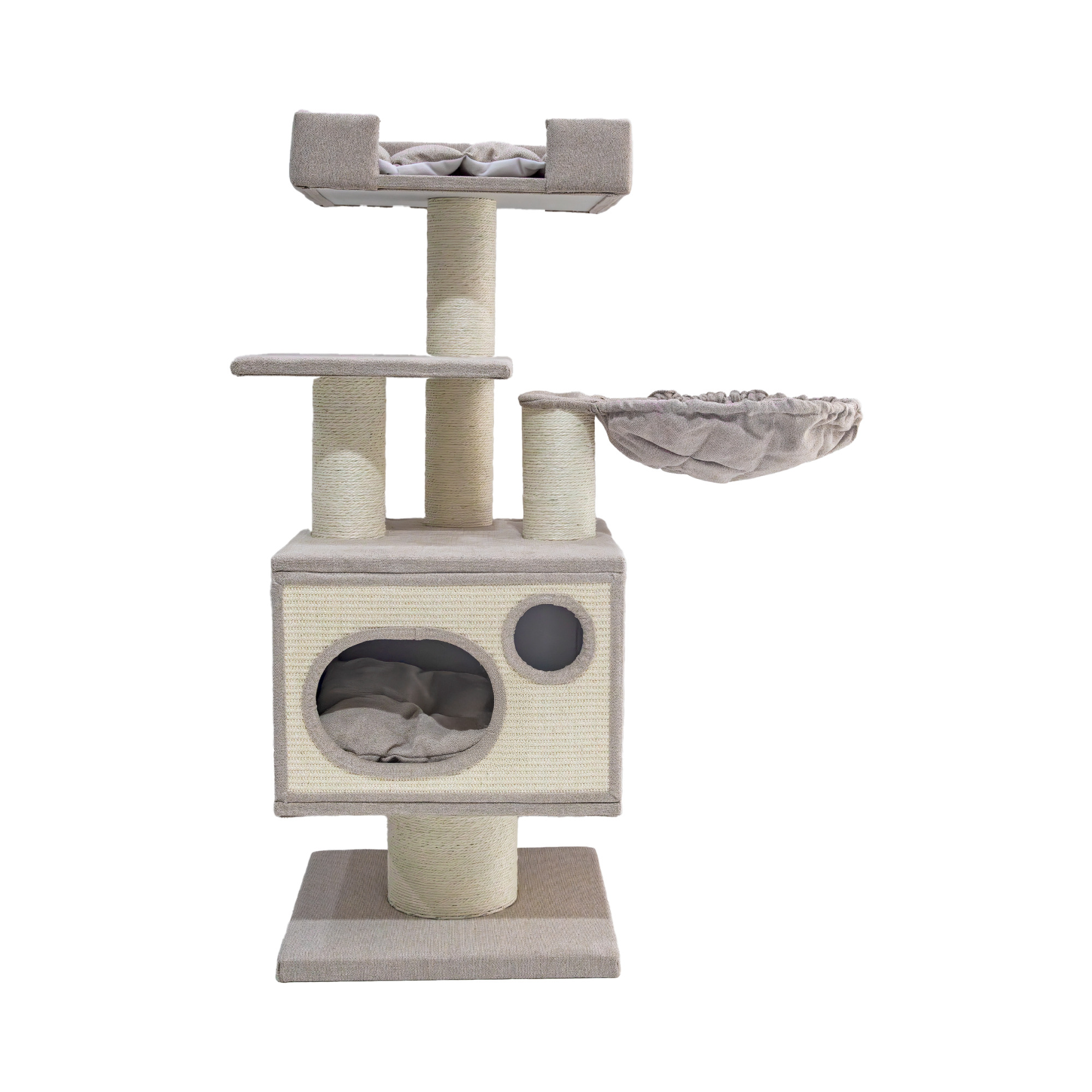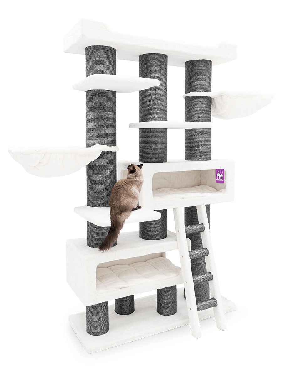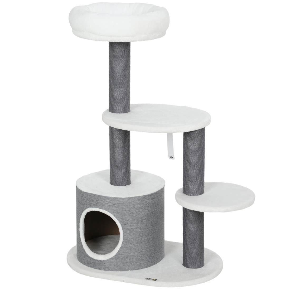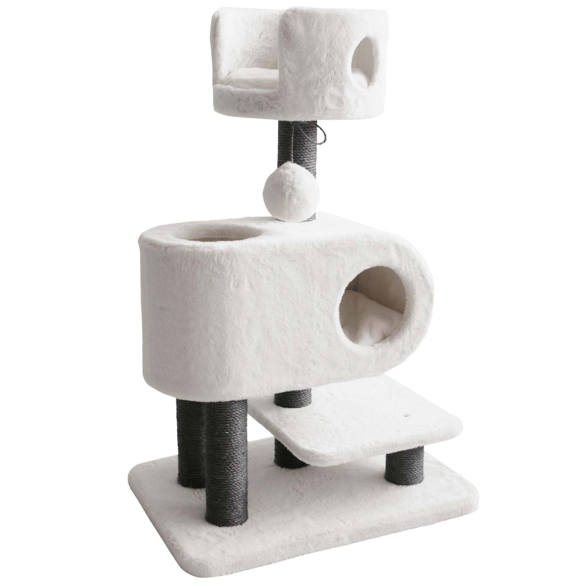 Klösträd med grotta, säng och plattformar – jutestolpar, vit/grå