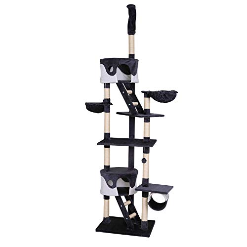 lionto XXL Klösträd för katter med sisal & plysch, höjd 230–250 cm, kattträd med plyschbollar inkl. bjällra, hängmattor, tunnel & kojor, passar små & stora katter, grå/vit