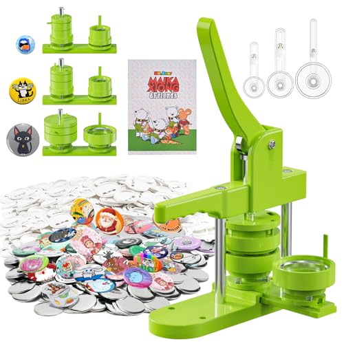 Aiment knappmaskin flera storlekar 600 st, fotostift emblem tillverkare 1 + 1,25 + 2,7 tum för barn, knapptrycksmaskin med 600 uppsättningar knapptillverkning tillbehör och skärare & magisk bok (grön,
