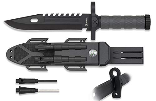 Albainox 32537 Svart kniv med flinta, slip och kompass, 19 cm blad och ABS-handtag, för hem, fiske, camping, utomhus, överlevnad och vildmark