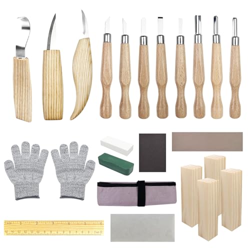 Träknivssats för nybörjare, barn och vuxna, träbearbetningssats med 8 stycken basswood carvingsblock, träbearbetningsverktyg, inkluderar 6 stycken knivar för träbearbetning, handskar, rullväska och