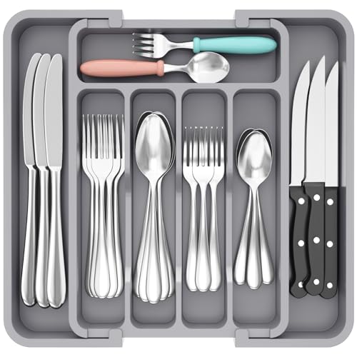 Lifewit Extra stor besticklåda, expanderbar till 91 cm lådorganisering för köksredskap, justerbar organiserare för bestick och köksredskap, kompakt plastförvaring för skedar, gafflar och knivar, Grå