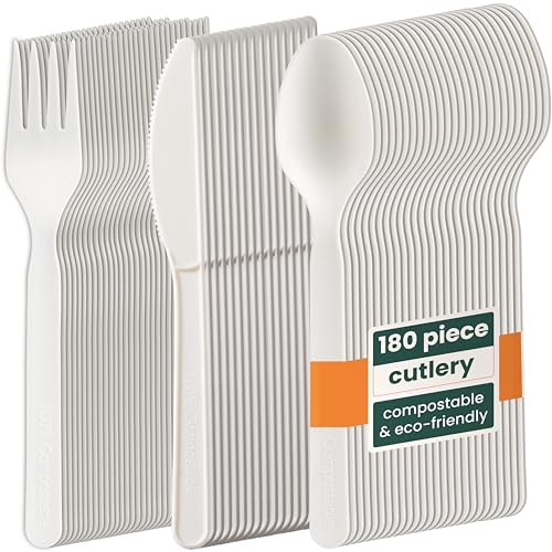 HAAGO 180 delar PLA bestickset Biologiskt nedbrytbart Komposterbart (60x knivar, 60x gafflar, 60x skedar, vit) - Miljövänligt Perfekt för catering och bröllop - Kraftiga 100% helt naturliga material