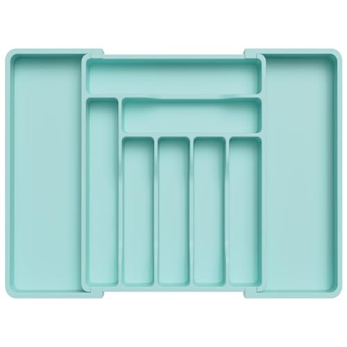 Lifewit besticklåda, organisatör, utdragbar bestickbricka för kökslådan, justerbar kökslådsorganisatör för redskap, bestick, förvaringsinsats i plast för skedar, gafflar, knivar, Stor, Turkos