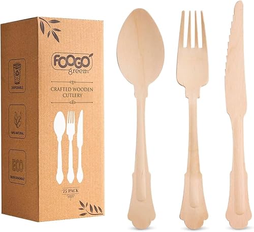 FOOGO Green FSC®-certifierad, elegant engångsbestickset, 75 delar, FSC®-certifierad, 25 gafflar, 25 skedar, 25 knivar, 20 cm, biologiskt nedbrytbart bestickset