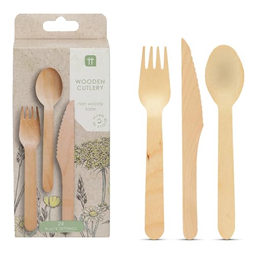 Samtalbord träbestickset – biologiskt nedbrytbara knivar, gafflar och skedar – perfekt för camping, picknick eller grillning – 24 set