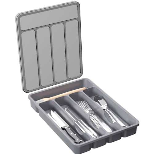 Lifewit besticklåda med lock, liten besticklåda i plast för kökslåda, hållare för bestick, matsilver, köksredskap, avdelare för skedar, gafflar, knivar, bordsbestick, 5 fack, Grå