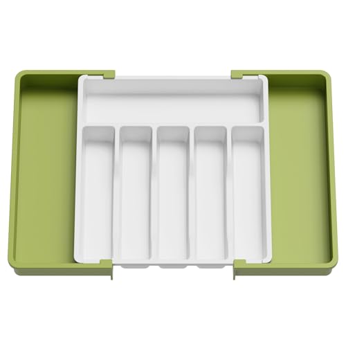 Lifewit organiserare för silverbestick, utdragbar besticklåda, lådinredning, justerbar lådinsats för bestick, kompakt plastlåda med plats för skedar, gafflar, knivar, stor, Grön och Vit