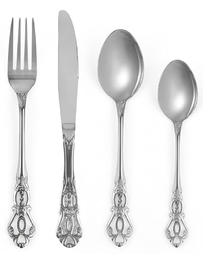 SHEUMNT Retro kungligt silverbestickset, 24 delar bestickset i rostfritt stål, består av knivar/gafflar/skedar, slitstark polerad finish, lätt att rengöra