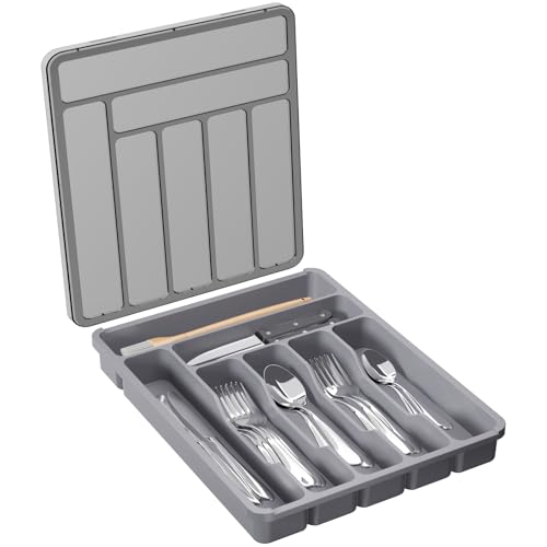 Lifewit bestickbricka med lock, bestickförvaringslåda för kökslådor och bänkskivor, besticklåda organisatör i plast för skedar gafflar knivar förvaringsinsats, 6 fack, Grå