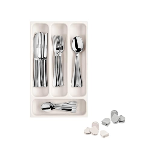 BUGATTI, Aladdin, 24-delat bestickset i rostfritt stål 18/10, förkromad ring och vitt handtag med pärlemor effekt. Bestickset för 6 personer: 6 skedar, 6 gafflar, 6 knivar och 6 kaffeskedar
