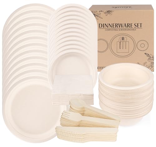 Fuyit 200 delat set med engångsservis, komposterbar, biologiskt nedbrytbar sockerrörsblast, miljövänlig servis inkluderar papperstallrikar, gafflar, knivar, skedar, för fest, camping, picknick