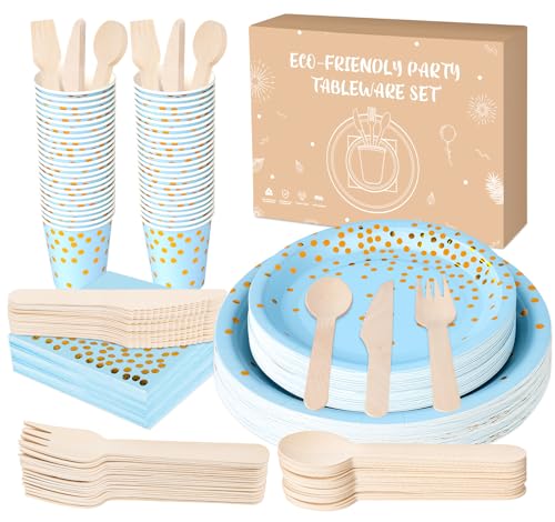 Anstore papperstallrikar blå med gyllene prickar, 200 stycken återanvändbara festservis set med gafflar knivar skedar servetter tallrik muggar, 25 gäster festtallrikar bestick för födelsedag, bröllop