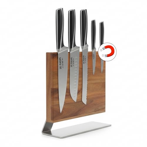 Les Plaisirs du Chef magnetiskt knivblock – premium knivhållare i akacia trä med bas i rostfritt stål – rymmer upp till 8 knivar säkert – hygienisk, halkfri, modernt kökstillbehör