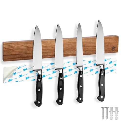 KÖKSMAGI® Magnetlist, kniv, OSKAR (40 cm) – magnetisk knivlist av trä med extremt stark magnet för tunga knivar – självhäftande (3M tejpband och med tillbehör för borrning